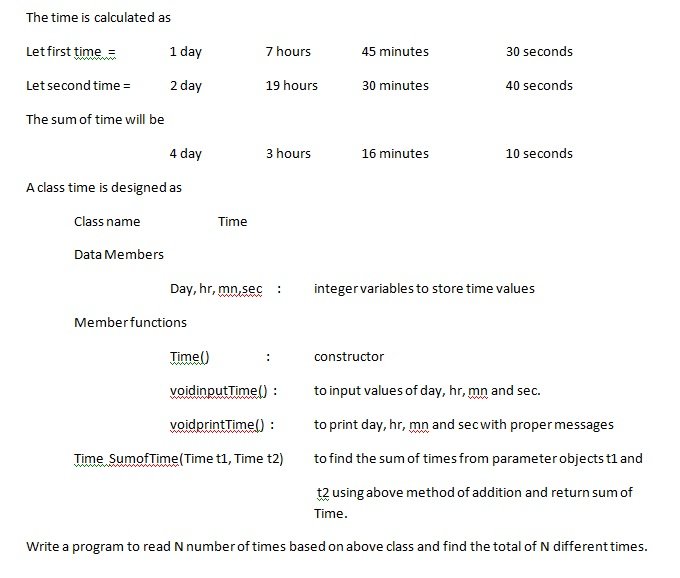 Time SumofTime(Time t1, Time t2) to find the sum of times from parameter objects t1 and